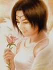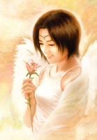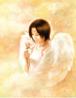 花を手にした天使が微笑んでいる様子。